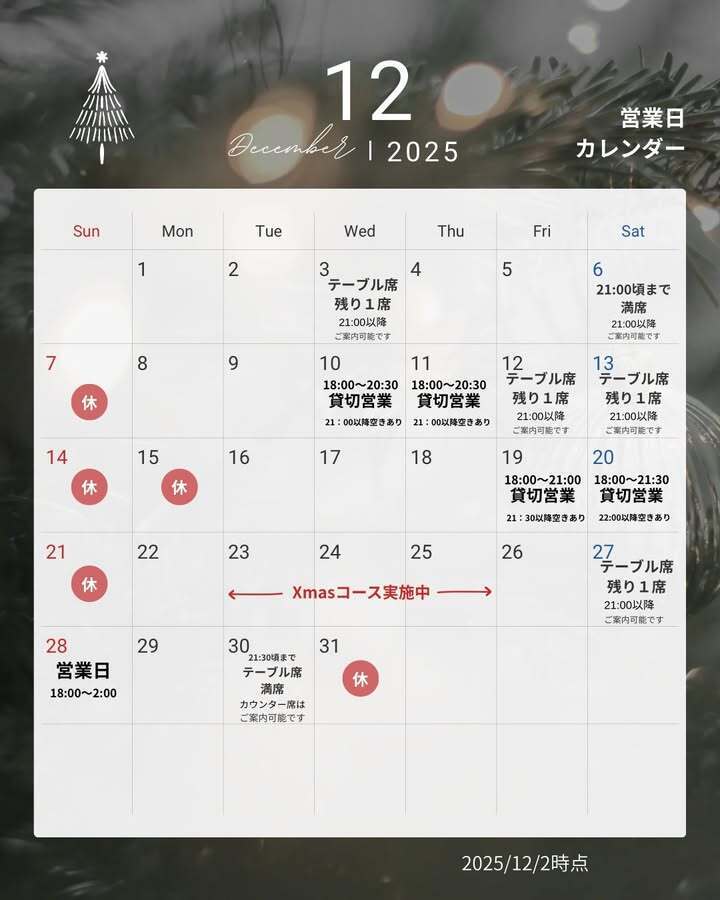 ポストのお写真①は12月のご予約状況と3日間限定コースのご案内になります💁🏻♀️