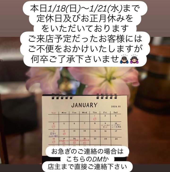 当店は1/18(日)〜1/21(水)の間、定休日及びお正月休みをいただいております🙇🏻♂️🙇🏻♀️